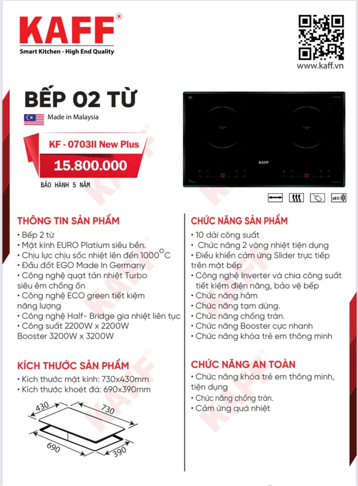 Bếp điện từ KAFF KF-0703II là dòng bếp 2 từ thông minh thế hệ mới của tập đoàn KAFF, bếp được nhập nguyên chiếc từ Malaysia với thiết kế nổi bật công nghệ điều khiển cảm ứng 2 Slider riêng. Công nghệ phím chọn chức năng ẩn hiện đại( Hiển thị khi mở nguồn). Chức năng mới đặc biệt chiên rán, hâm nóng, rả đông, nấu cơm, cảm ứng chống tràn.